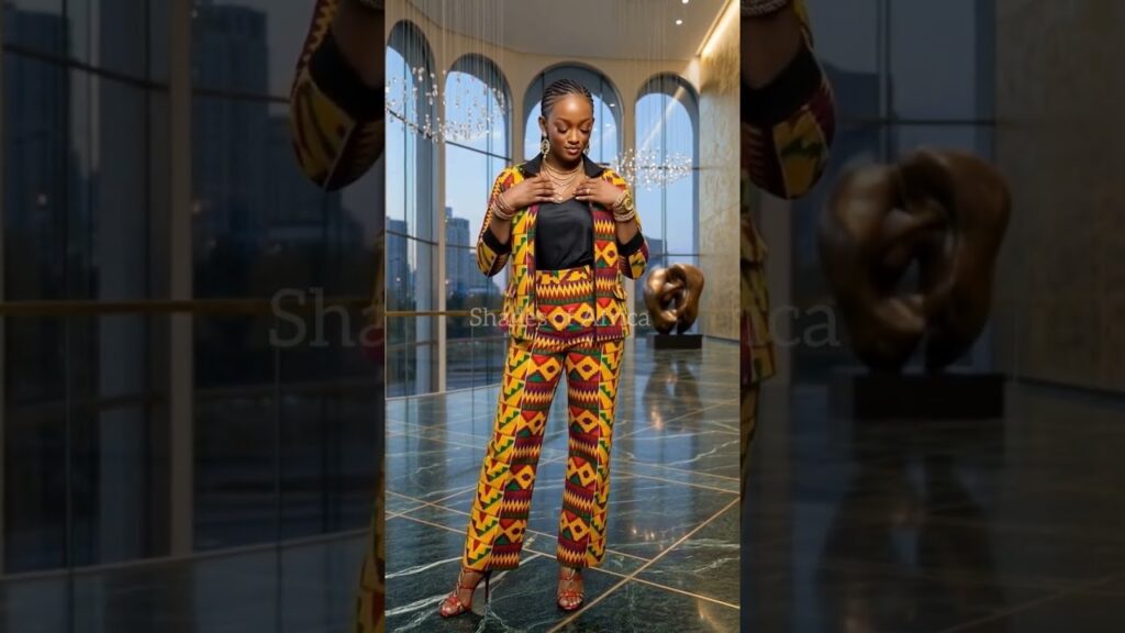 Accessorized with layered gold jewelry and statement earrings, this ensemble elevates traditional African textile design into a contemporary fashion statement perfect for events, fashion-forward workwear, or upscale gatherings. The tailored fit, premium fabric texture, and clean finishing details showcase both craftsmanship and style authority.