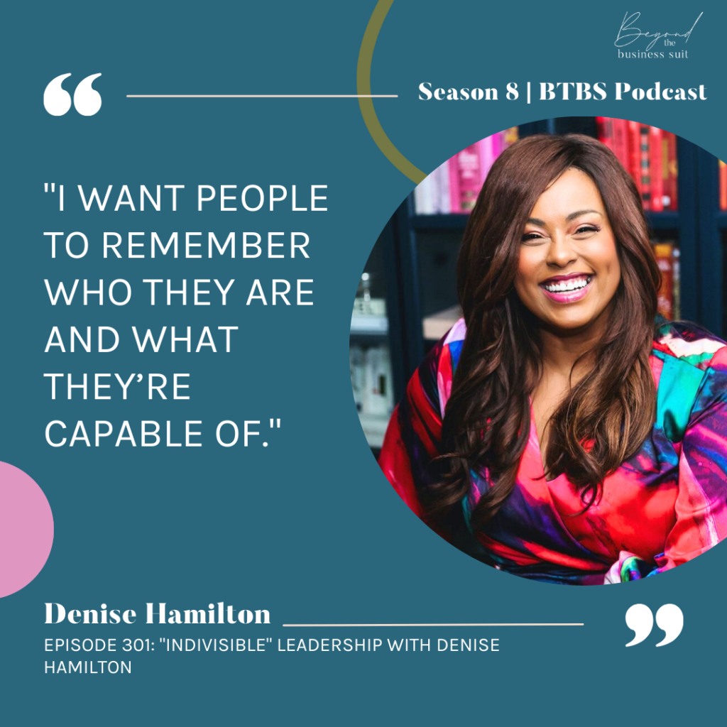 Are you truly operating at your highest level to make the most significant impact for all? This is what diversity and inclusion leader, author and speaker, Denise Hamilton, is calling us toward in her groundbreaking debut book, Indivisible. In our latest episode of the Beyond the Business Suit podcast, Denise dives deep into her work of building more inclusive communities and workplaces, and offers her insights on how leaders can make significant change and create conditions that allow people to thrive. She even highlights some of the biggest challenges she and other DEI leaders have been facing given the current landscape and how DEI has been perceived. Not only does Denise’s fortitude highlight the effort and patience required to see forward momentum, but her infectious optimism serves as a guiding light for us all toward a brighter future.