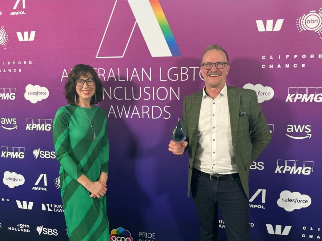 Two people stood in front of an Australian LGBTQ Inclusion Awards event back drop