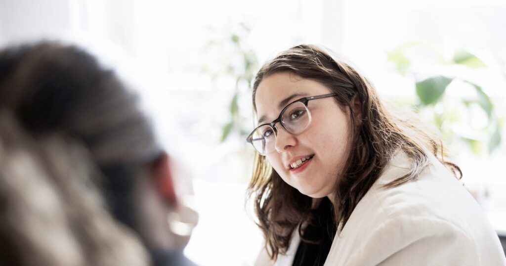 Two women are pictured in an office setting. One young professional woman smiles as she listens to her coworker.
